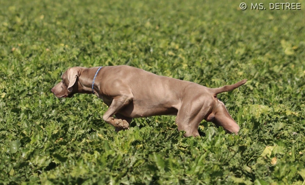 Le braque de weimar est très élégant sur le terrain, il se déplace d’un galop puissant, la tête au dessus de la ligne de dos et le nez au vent afin d’optimiser la prise d’émanation.